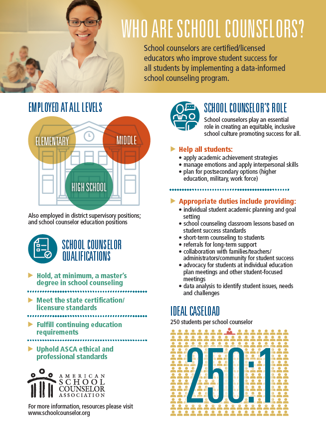 School Counselors follow the ASCA (American School Counseling Association’s) National Model, which includes the following three areas: